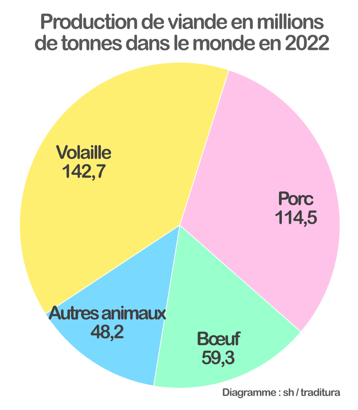 4) Cf. Statista.com, 2024: Verschiedene Statistiken, tiré d'Internet le 25.09.2024, Données sur la production de viande : https://de.statista.com/statistik/daten/studie/28782/umfrage/die-globale-fleischerzeugung-seit-1990/, Geflügelfleisch: https://de.statista.com/statistik/daten/studie/28877/umfrage/erzeugung-von-gefluegelfleisch-weltweit-seit-1990/, Schweinefleisch: https://de.statista.com/statistik/daten/studie/261938/umfrage/weltweite-nettoerzeugung-von-schweinefleisch/, Rindfleisch: https://de.statista.com/statistik/daten/studie/317712/umfrage/produktion-von-rindfleisch-weltweit/